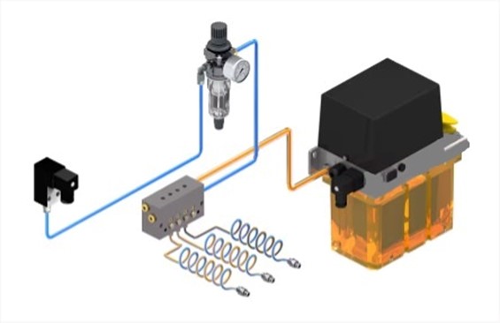 In oil-air lubrication systems, a precisely measured amount of oil is dispersed by a steady flow of air inside a tube. The oil travels along the tube wall, following the direction of the compressed air. At the mixing point (mixing valve), the oil is introduced into the air stream in pulses, creating an almost continuous flow that exits through the nozzle in fine droplets, which are delivered to the rolling bearing without direct contact. This process ensures that the bearing housing is maintained under slight positive pressure, preventing dirt from entering the sensitive bearing areas. The carrier air, nearly oil-free upon exiting the bearing, ensures no oil mist or fog is produced, making the system environmentally sustainable. Distant system components are serviced by a lubrication system through a satellite unit. If expansion is required, additional stations can be seamlessly integrated into the system.